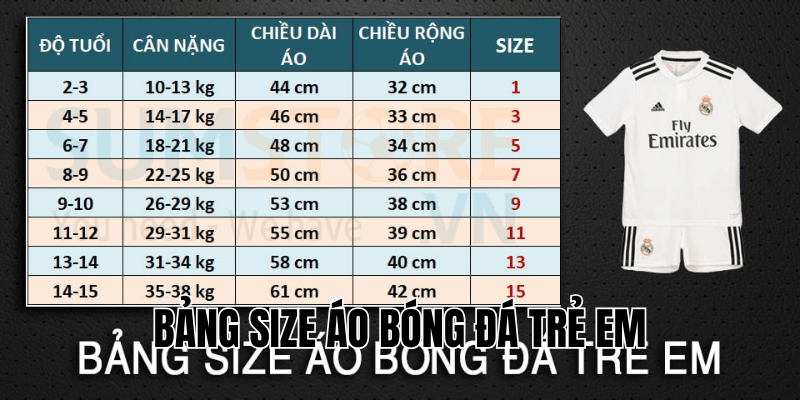 Bảng size áo bóng đá trẻ em chuẩn